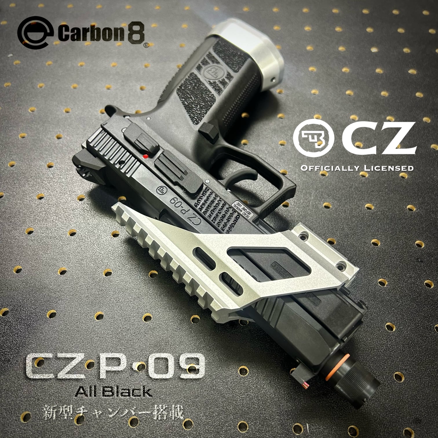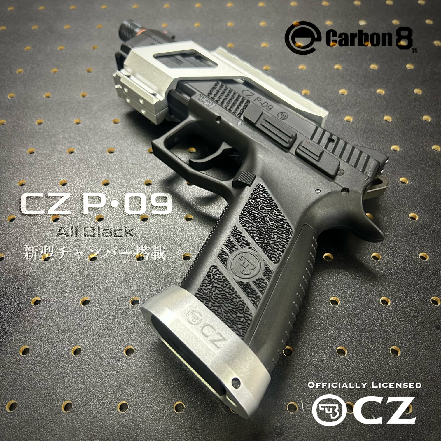 実銃CZ社オフィシャルライセンスモデルP09を純正アクセサリーと純正パーツでコンプリート・カスタムを施しました。本体カラーBlackは一般流通品では新型V2チャンバーを未だ実装していない為、ここでしか買えません。